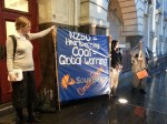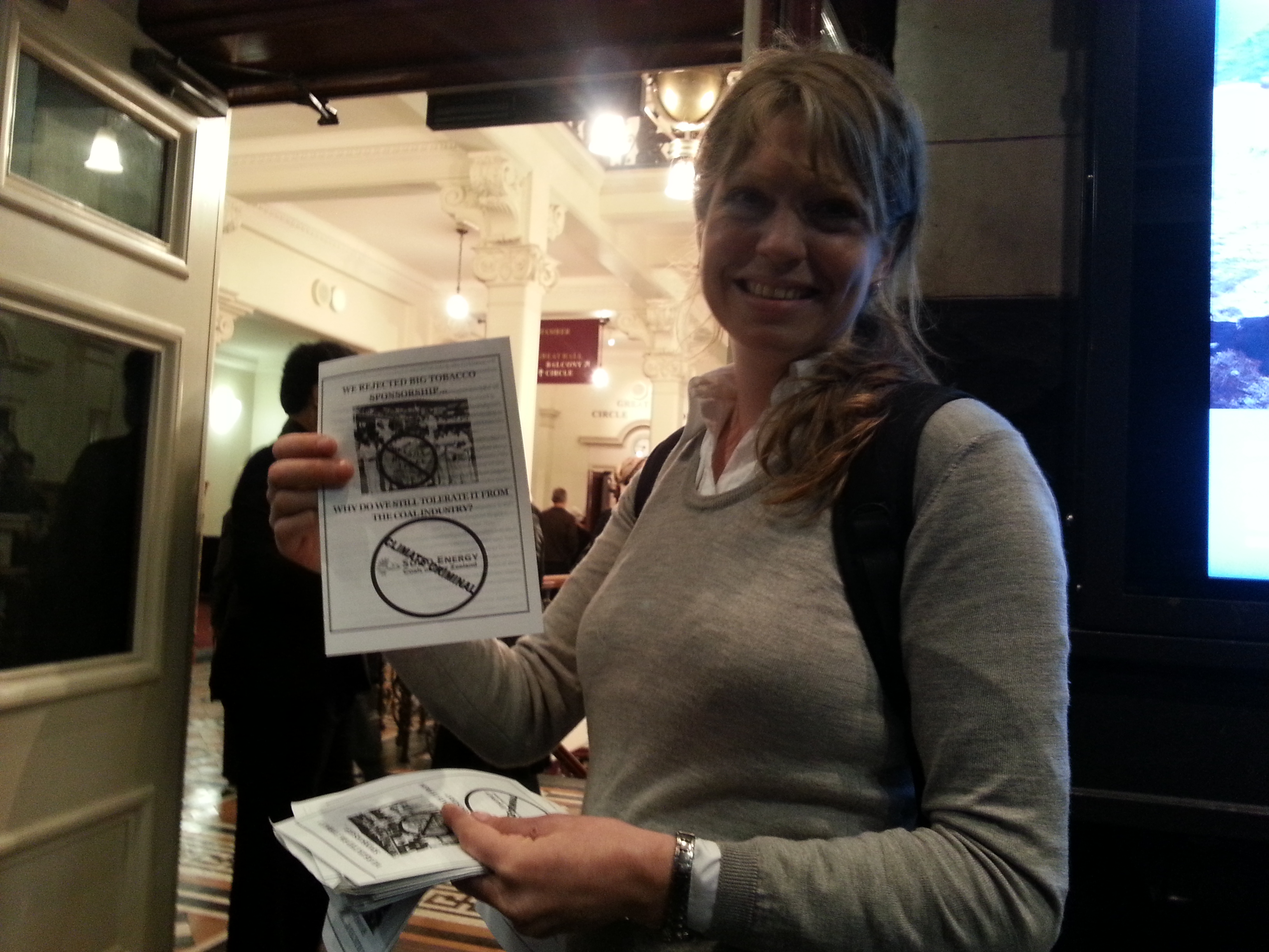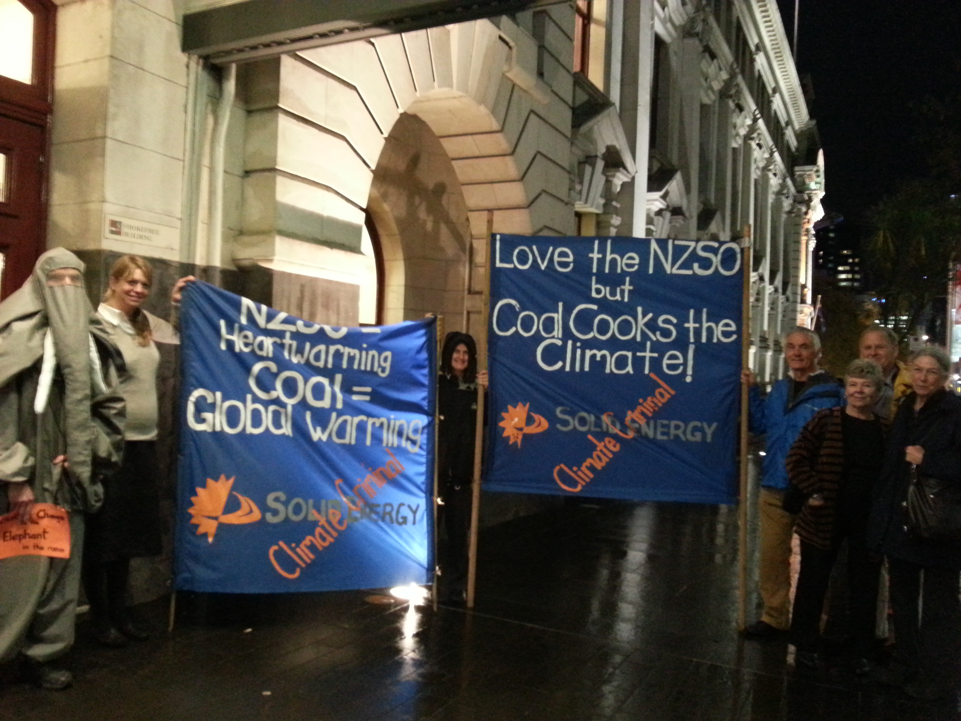 Auckland Coal Action ‘attended’ the final show in the New Zealand Symphony Orchestra’s Solid Energy Tour. We held banners at the doors and handed out leaflets to concert-goers with the message that we should no longer accept coal sponsorship.