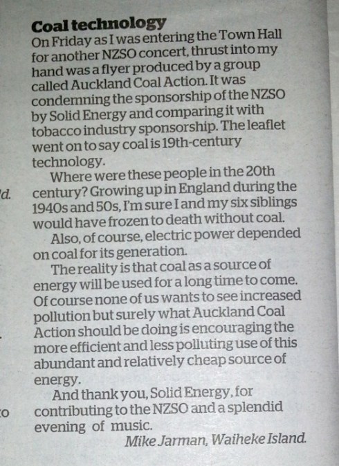 One of the patrons of the New Zealand Symphony Orchestra took exception to our presence at the final concert in the ‘Solid Energy Tour’. He was annoyed enough to write to the editor of the New Zealand Herald.