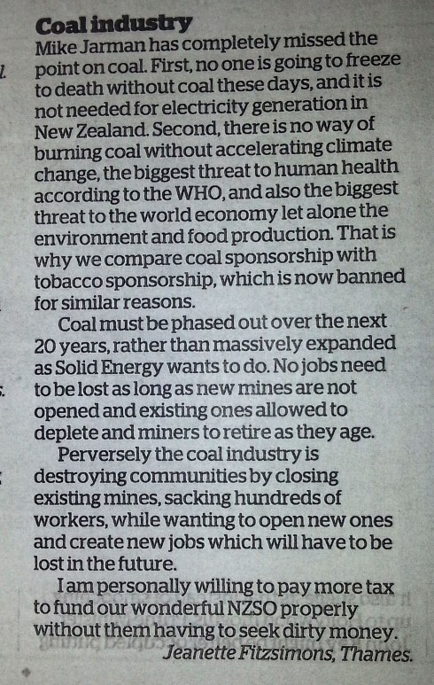 This elicited a number of letters in response, supporting the stance taken by Auckland Coal Action in pointing out the dangers of coal and describing coal sponsorship as akin to tobacco sponsorship.