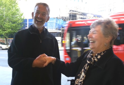 At our second protest of Solid Energy sponsorship, Mike and Lynne met in person for the first time. Both were good sports, despite having disagreed so vehemently in print.