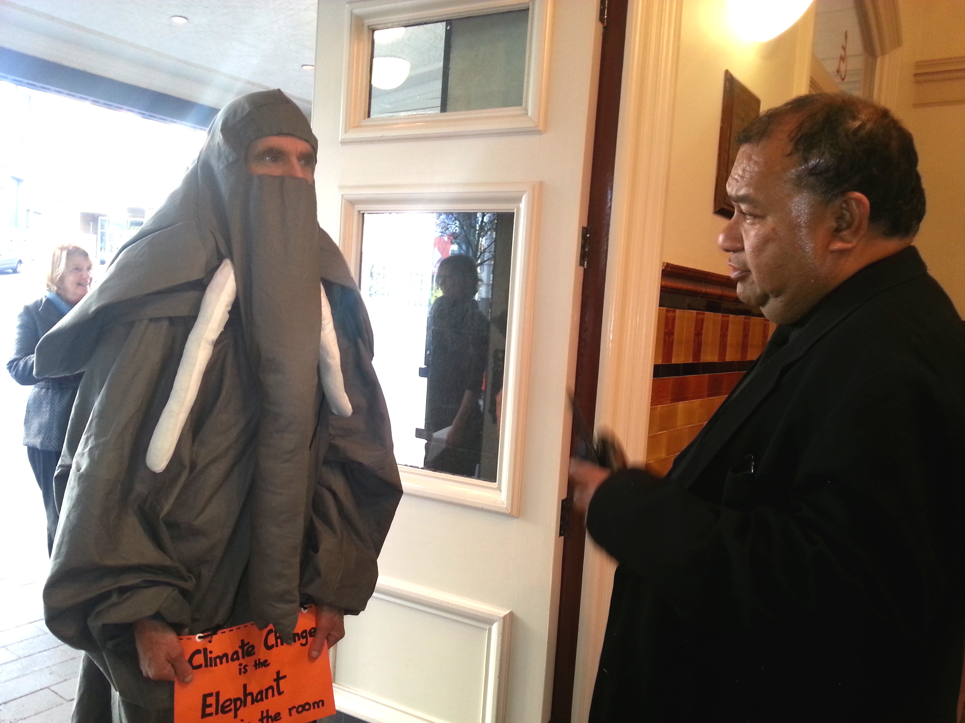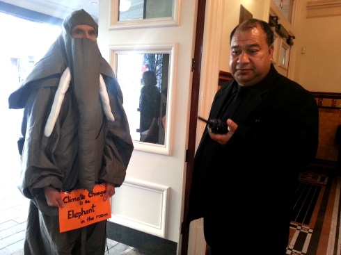 Climate change is the elephant in the room when we talk about coal mining, but this evening our very own Climate Elephant was barred from entering the room by security guards.