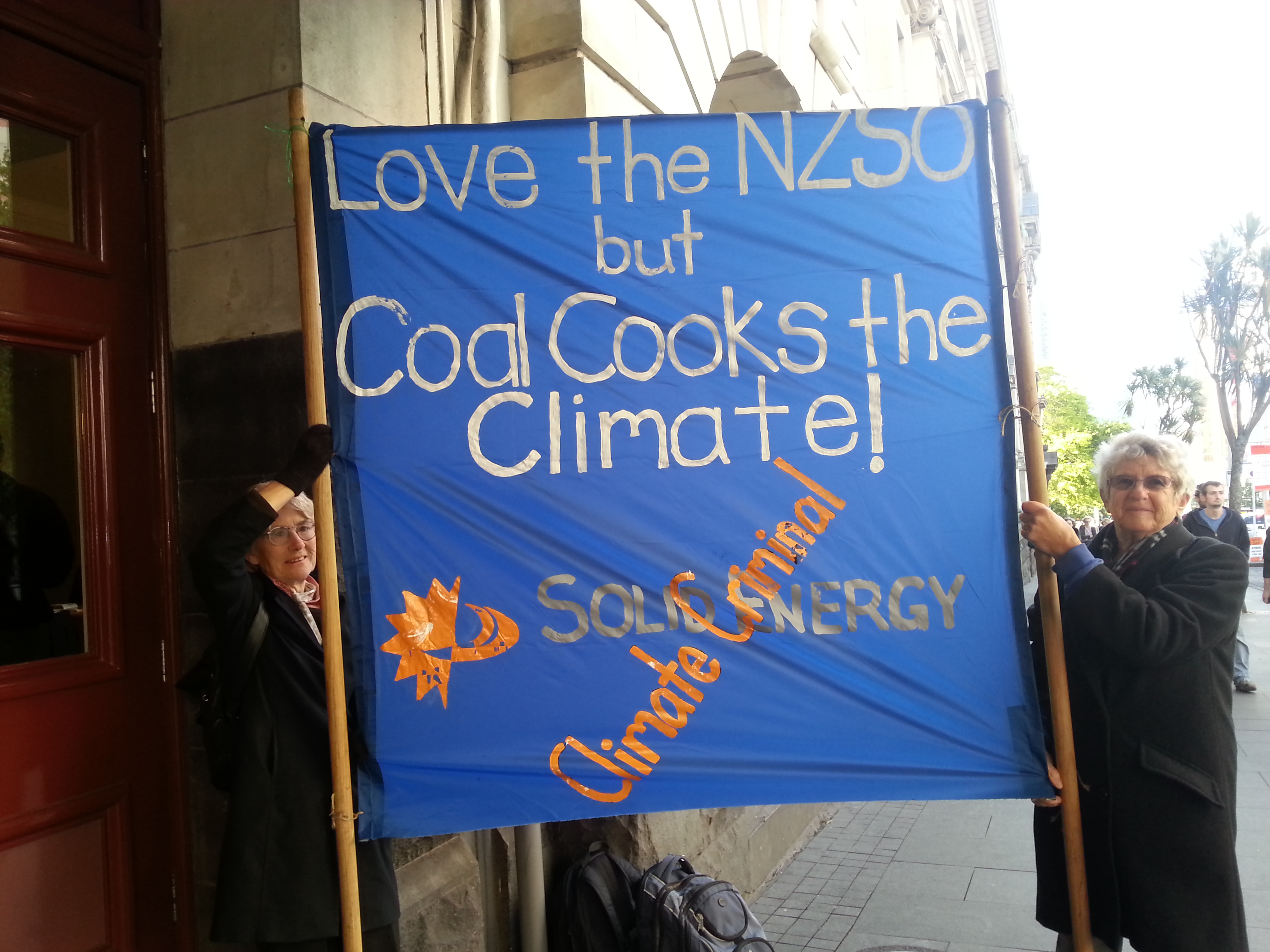 We were there to let orchestra patrons know what kind of company was sponsoring the event, giving them copies of our open letter to the NZSO in which we urged the orchestra to ditch Solid Energy.
