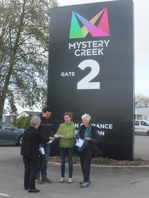 Members of Auckland Coal Action handed out nearly 2000 fliers to Mystery Creek visitors yesterday, fliers that announced Fonterra was getting out of coal and switching to the “fuel of the future” – woodchips – instead, and had small bags of woodchips attached. They invited people to ask Fonterra about their fuel for drying milk powder.