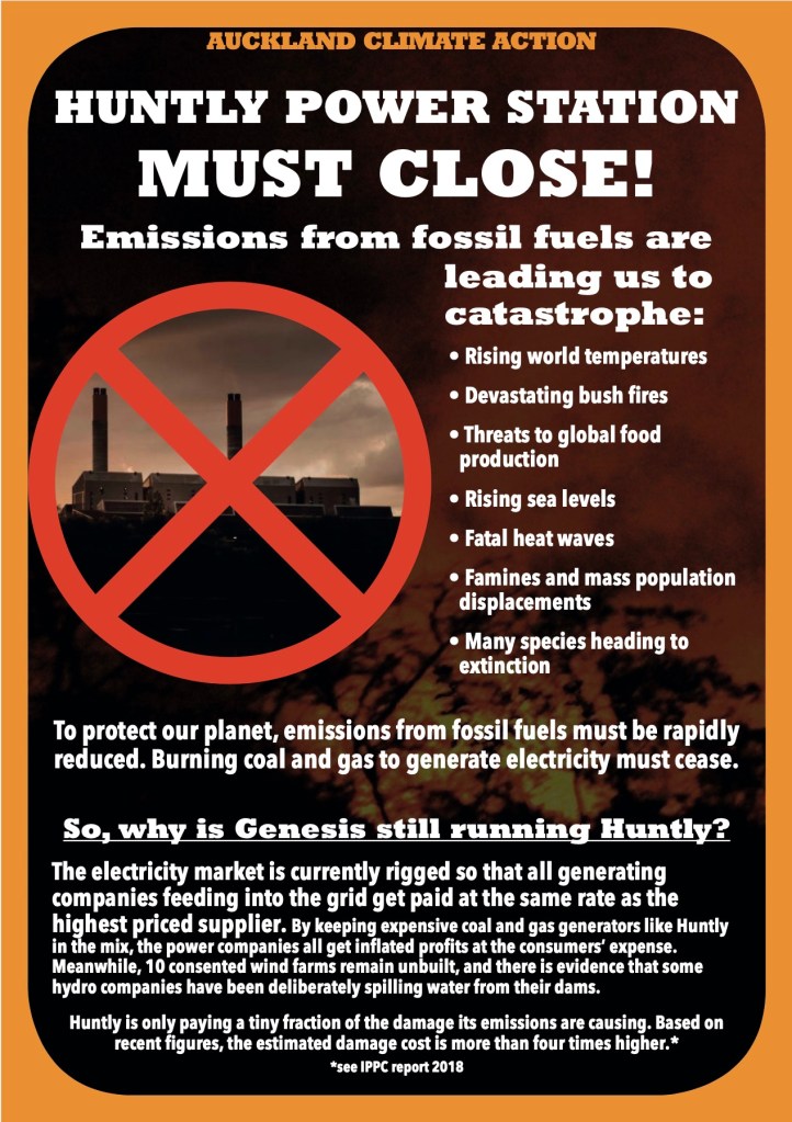 Please support our protest HUNTLY POWER STATION MUST CLOSE on the 9 th of October 2020 against the continued burning of coal by Genesis Energy. We will meet at the corner of Great South Road and Park Avenue, Penrose at 3 o’clock, from where we will march to Genesis. At 4 o’clock we will march from Genesis over the footbridge to Ellerslie Train Station. We will be displaying banners on the pedestrian bridge over the highway and hand out printed brochures to commuters at the Ellerslie Train Station.